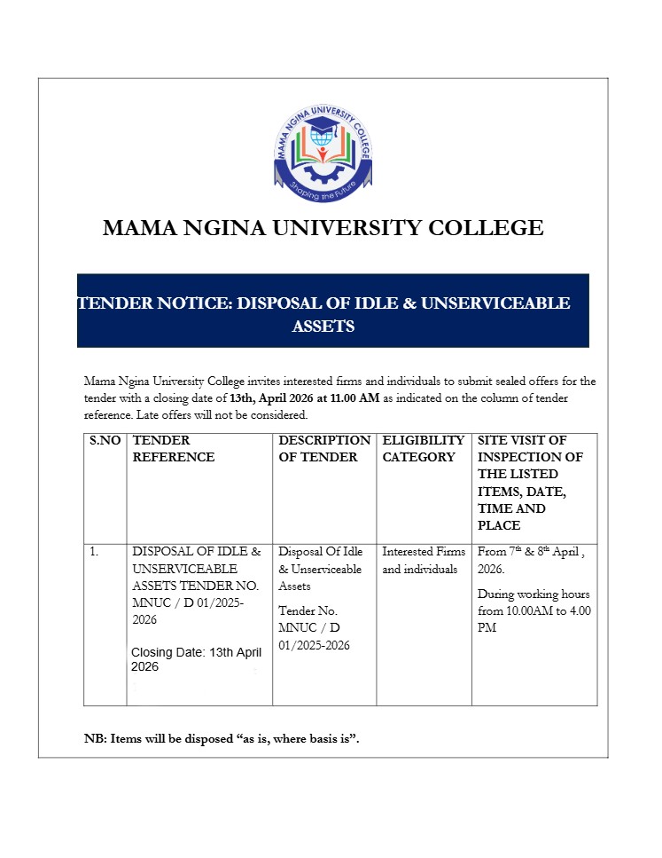 Mama Ngina University College invites interested firms and individuals to submit sealed offers for the tender with a closing date of 13th, April 2026 at 11.00 AM as indicated on the column of tender reference. Late offers will not be considered.